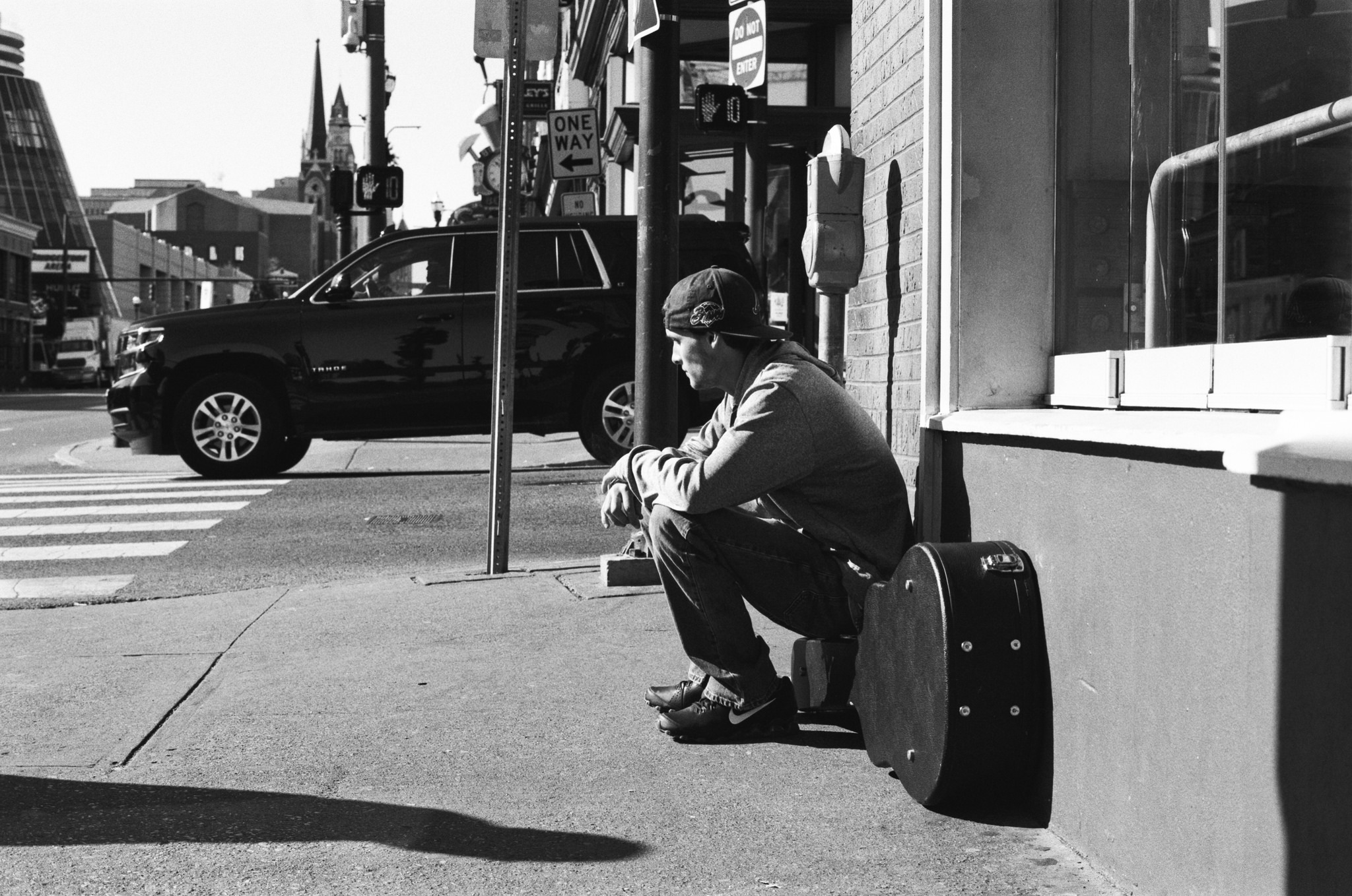 As I walked up Broadway I noticed a young man sitting on a guitar case at the corner. When I got close, I knelt down to take the shot. He noticed me and turned away.