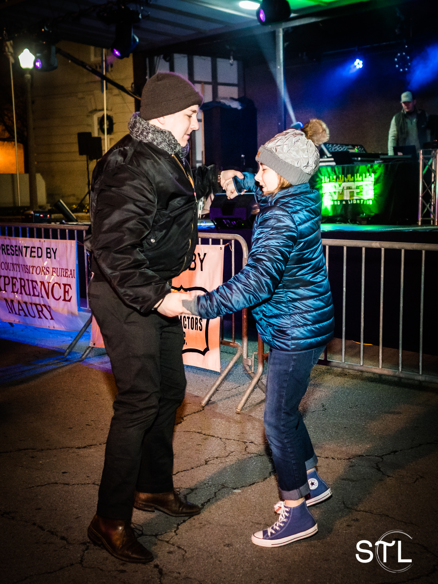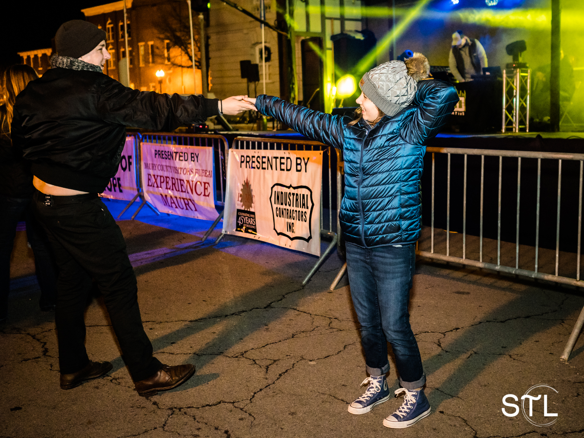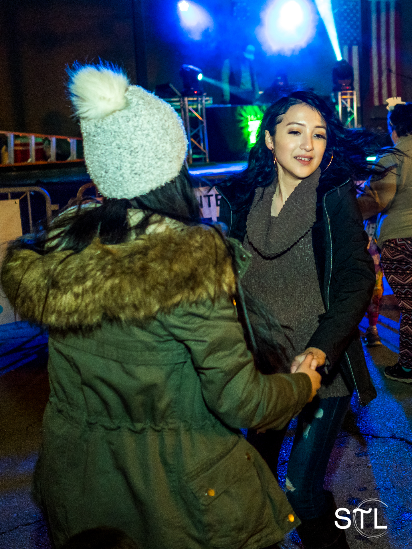 I started the night capturing the scene around the courthouse. There were more food trucks at this year’s event. There was a stage and a fenced off area for dancing on the southwest corner of the courthouse. The cool lighting effects and sound was provided by Amped Sound and Lighting with DJ Vanilla Ice stoking the flames. These guys know how to put on a show. I met the owner. He gave me a quick rundown of his setup and showed me the controls on his tablet – cool stuff! As it got closer to midnight, more people descended on the square. The temperature was close to the freezing mark, but between the party atmosphere and maybe some adult beverages for some of the grownups, it didn’t seem like the cold affected anyone.