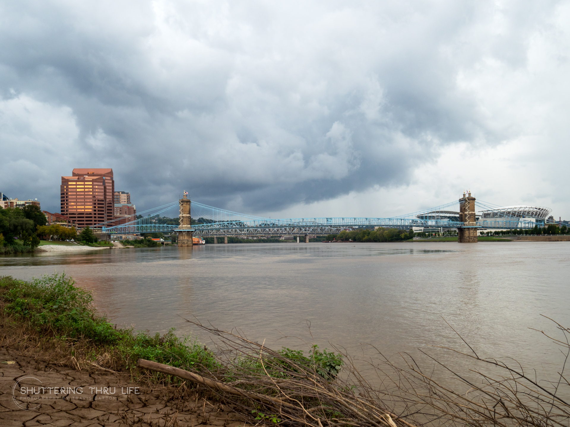 Raindrops begin to fall as the ominous cloud made its way over the Cincinnati skyline. I started walking east along the river’s edge to set up a shot. The rain started to fall a little harder, but I was still not discouraged as I setup to take the shot below.