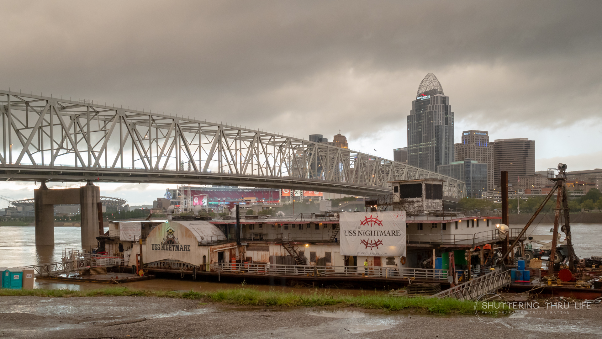 I called my wife while I was under the tent. I told her where I was and what I just photographed. She immediately googled the USS Nightmare and gave me the rundown. Further investigation revealed that this was a dredge ship named the Williams S. Mitchell. Its purpose was to dredge the bottom of the river to clear the waterways. Legend has it that it dredged up a burial ground which cursed the ship. One faithful day it broke away from its dock and floated down the river hitting bridges before it came to a stop. This was known as the Mitchell Massacre as it killed all crew members including Captain Mitchell and his only daughter Anna. Anna’s body was never found. Today it’s a haunted attraction and museum called The USS Nightmare. Although, it is currently out of commission due to flood waters.