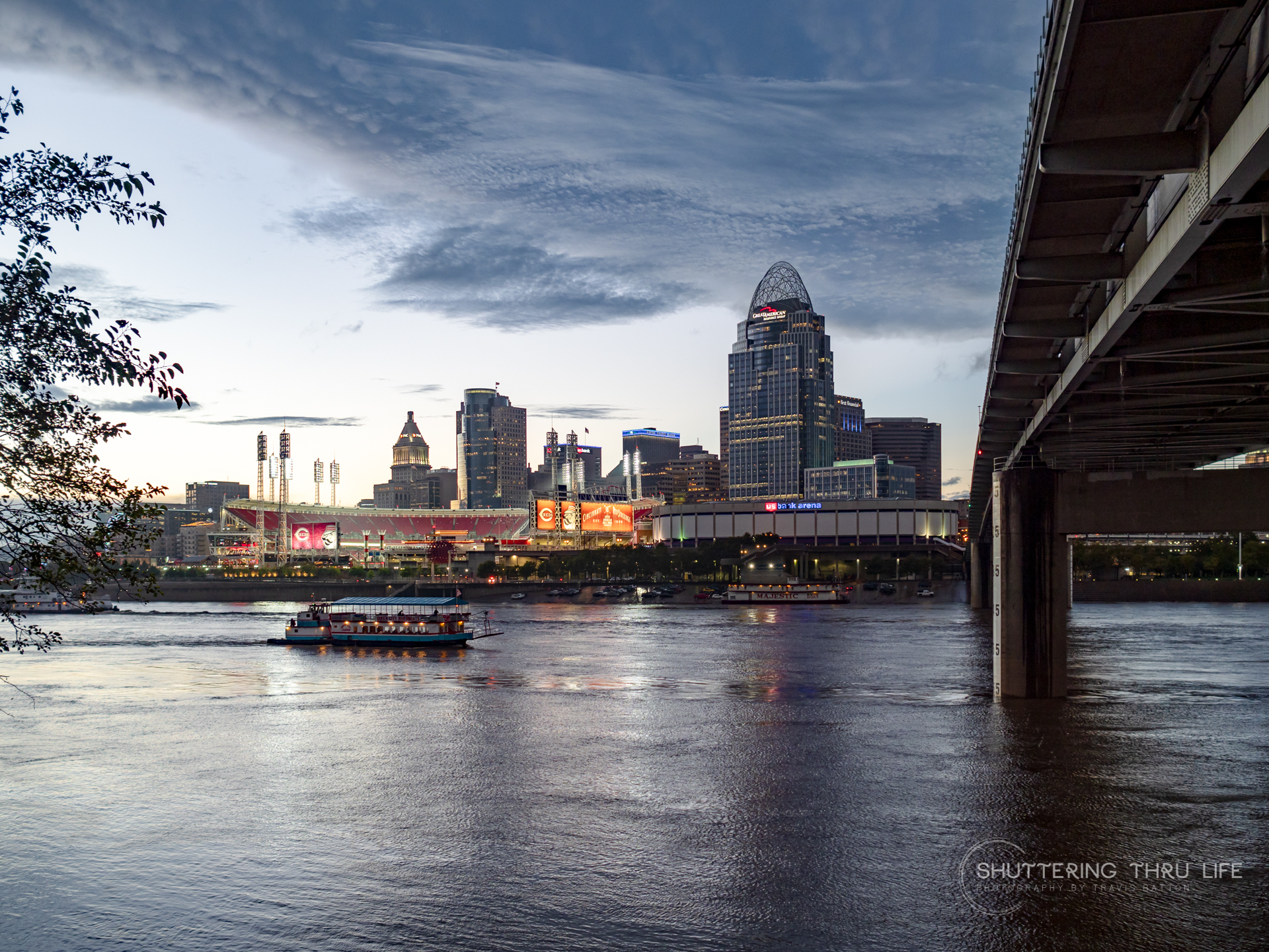 With the rain gone and the sky clearing, I was at the point where the night lights were beginning to dominate the scene. I was glad to see that there was a Cincinnati Red’s game happening across the river at the Great American Ball Park. The stadium lights play a big part of the nighttime skyline. Looking at the empty stadium, you might think there wasn’t a game. The rain may have something to do with that, but my son was telling me that the MLB is having some attendance issues. Nevertheless, I’m glad the lights were beaming.