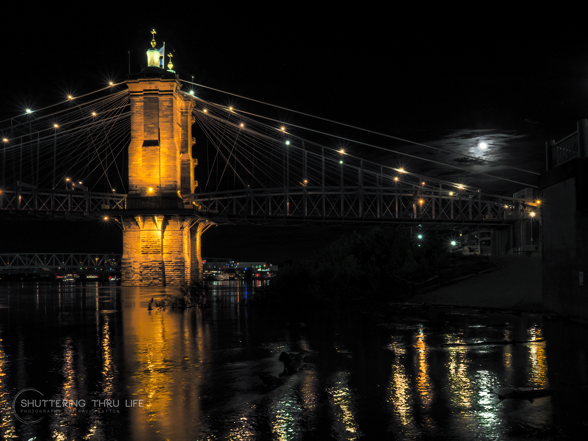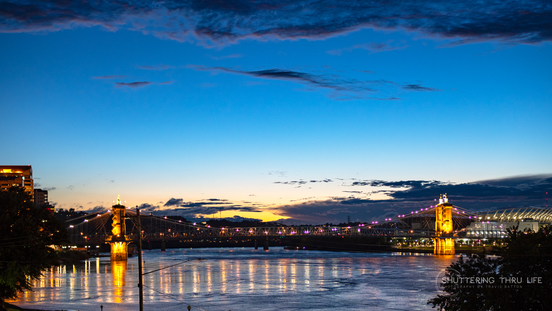 After I made the above shot, I figured I would grab a bite to eat and head back to the hotel. As I walked back to my car, the scene of the illuminated John A. Roebling Bridge grabbed my attention. The clearing blue sky with a hint of color at the horizon was the perfect backdrop for the bridge and the reflections in the Ohio River.