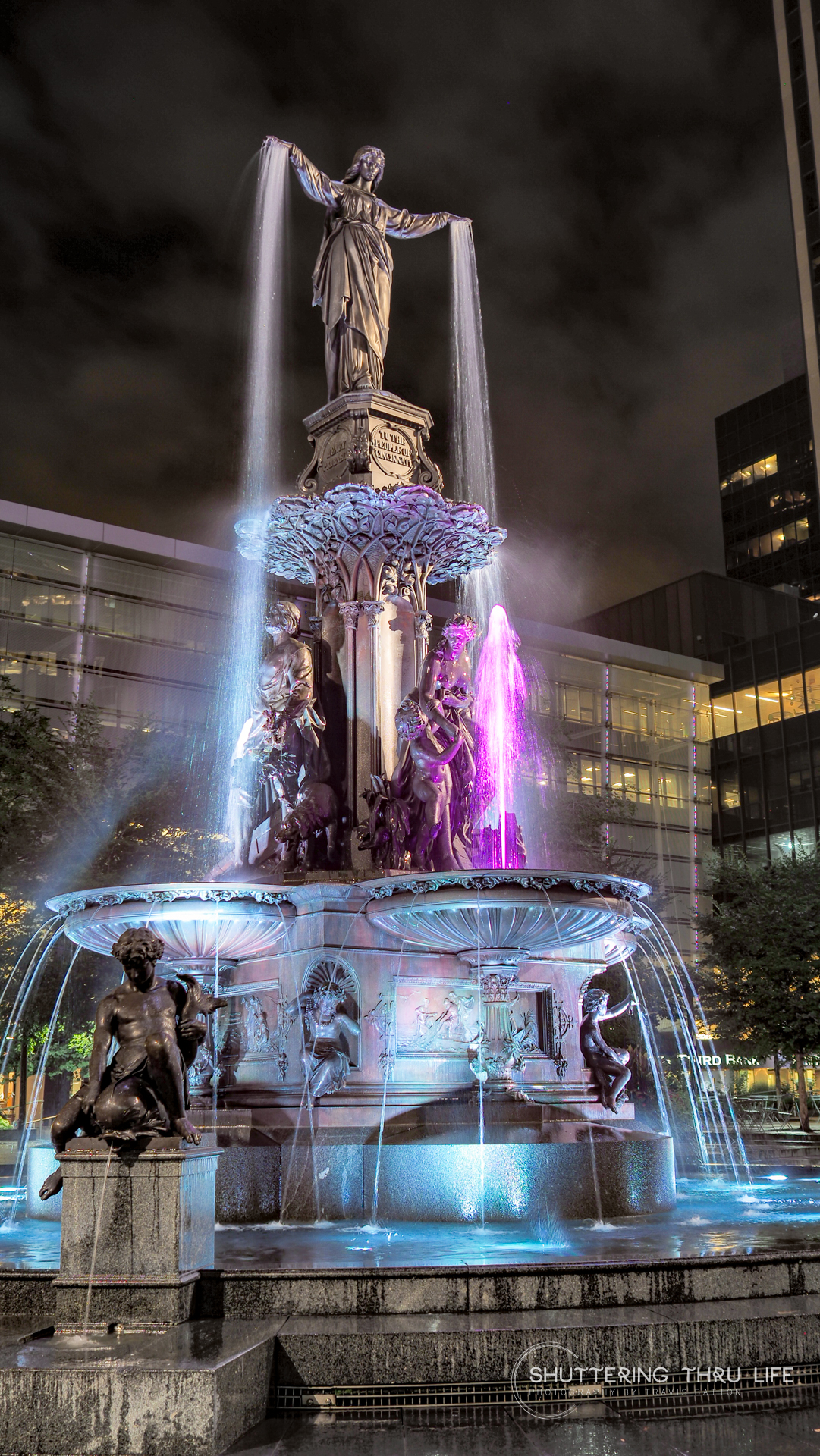 I had to make one more stop before calling it a night. I was intrigued by the fountain on the brochure in my hotel room. When I saw that it was located in downtown Cincinnati at Fountain Square, I put its location down as a wave point in google maps. This fountain is known as the Tyler Davidson Fountain. After Tyler’s death, his brother-in-law and business man, memorialized him with this fountain. Fountain Square is one of the most visited places in Cincinnati. The statue is seen in the opening credits of the famous sitcom “WKRP in Cincinnati.” Ronald Reagan delivered one of his campaign speeches in this square. I settled on a up close portrait oriented shot because there were a lot of empty seats and umbrellas in front of the fountain that I did not want to capture. I also shot this with a 16:9 orientation to allow me to get the entire fountain. At the moment, the 17mm is wide as I can go. A wide angle lens is on my short list.