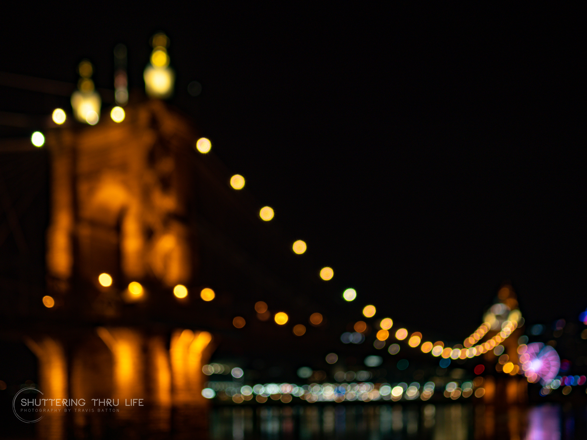 I ended the night after taking a couple of shots on the other side of the bridge. As I was messing around with the focus ring, I liked what I saw when the scene was out of focus. The defocused balls of light along the suspension bridge made a cool shot.